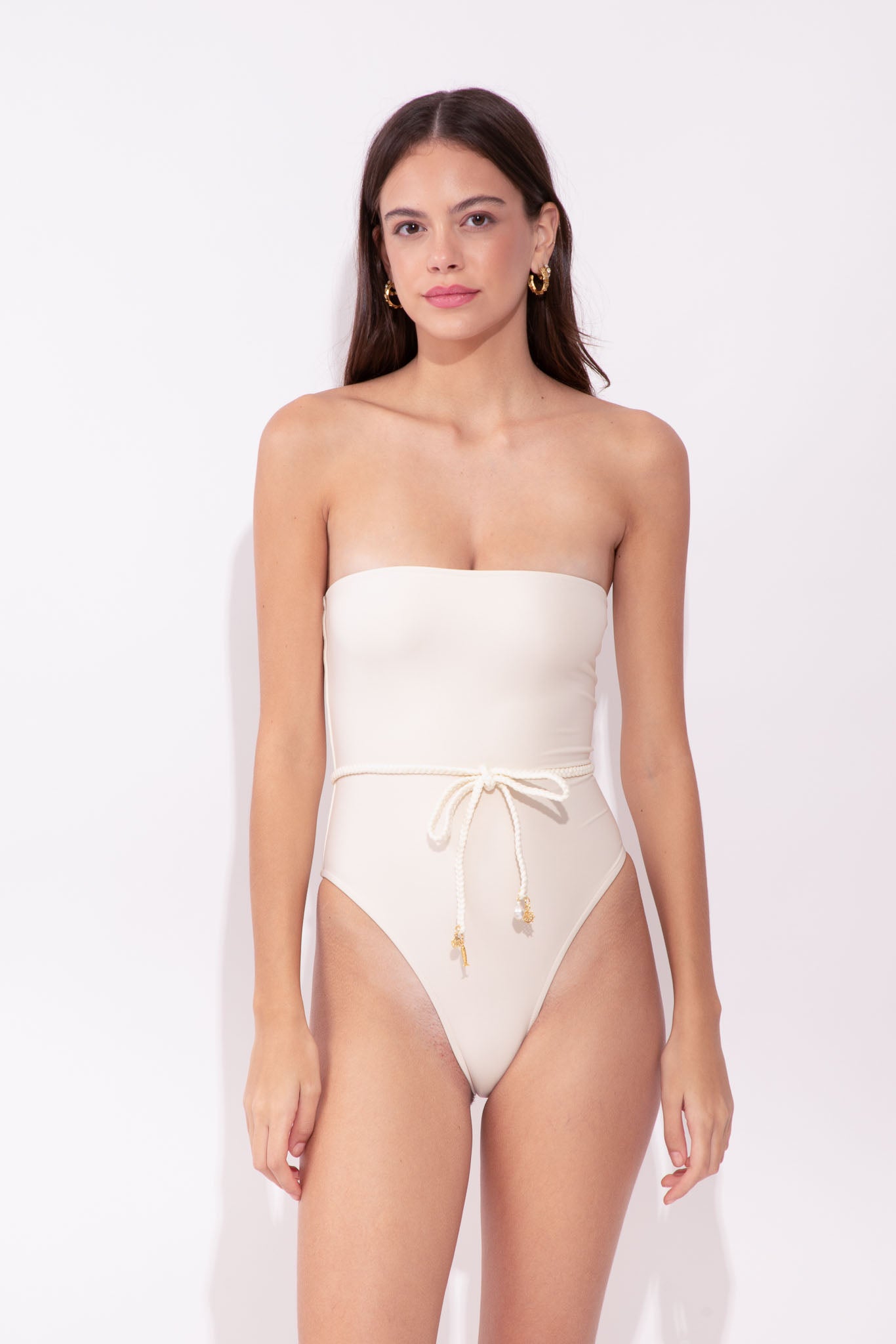 O Maiô Beatriz traz modelagem tomara que caia com cintinho trançado de amarração frontal que valoriza a silhueta com detalhes de pingentes muito fofos.