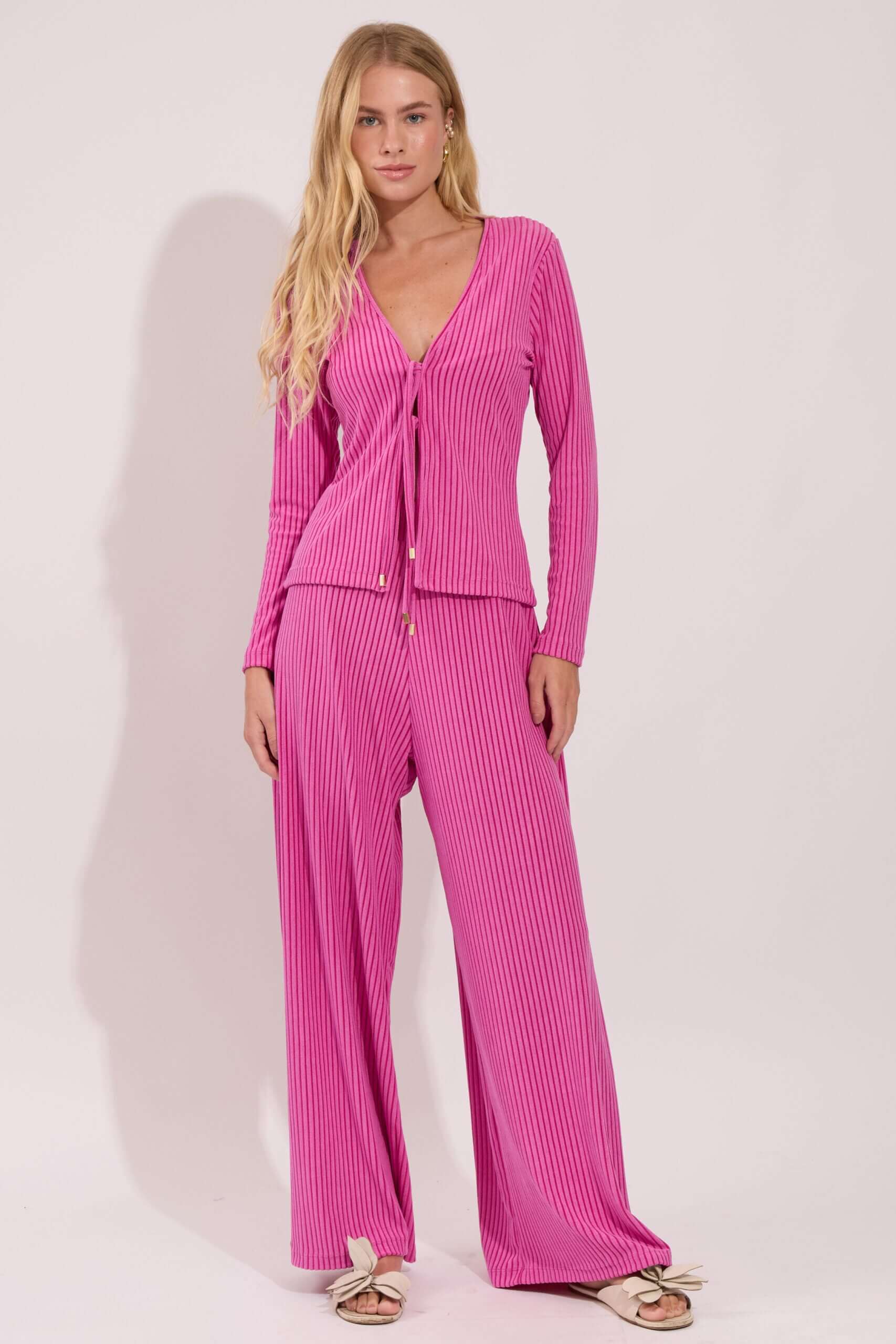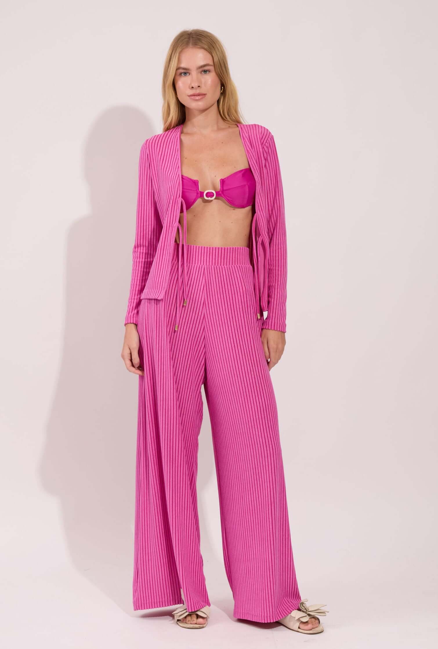 A Calça é uma calça pantalona com elástico em tecido listrado com textura que lembra um atoalhado, super gostoso perfeito para um after beach ou um look comfy