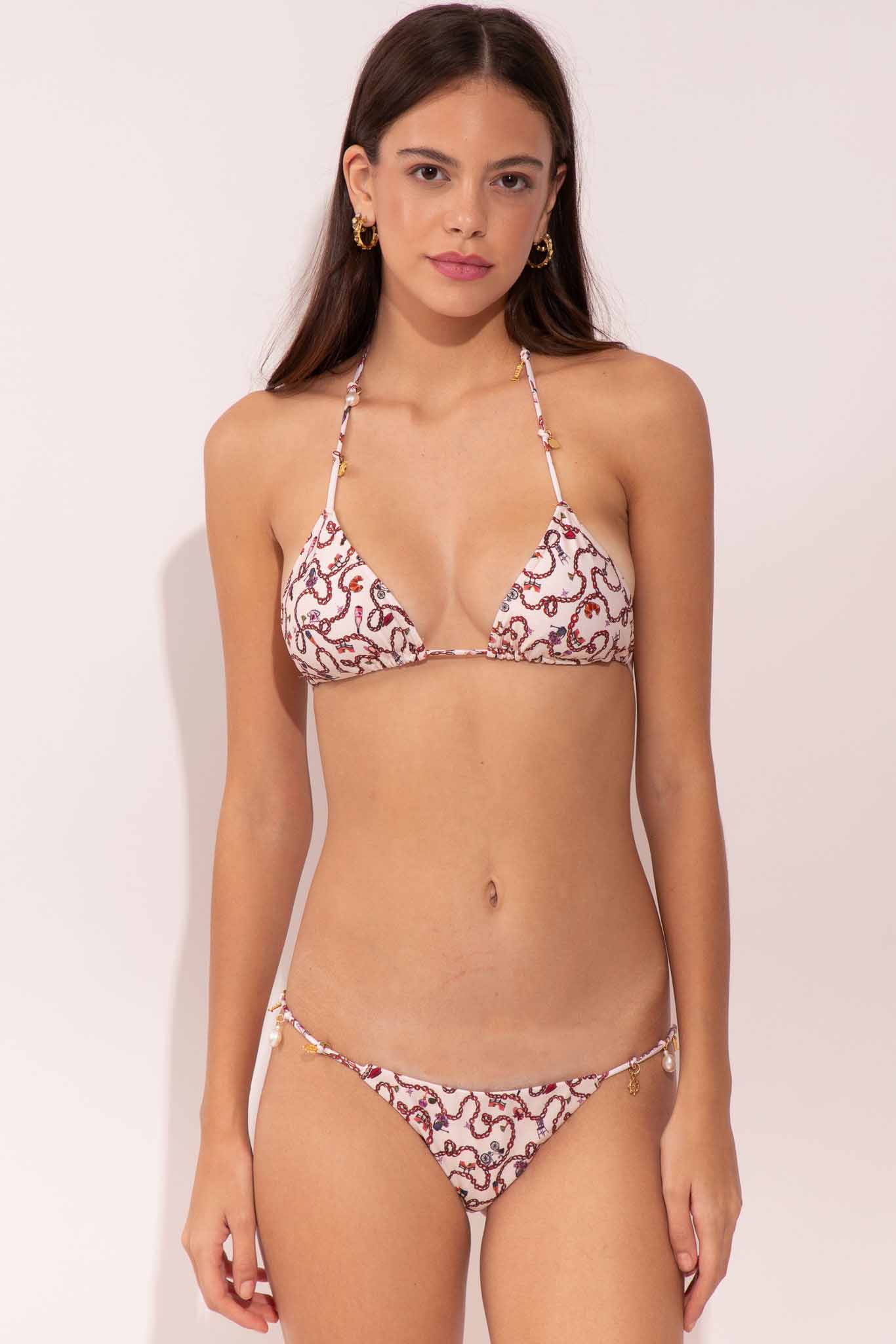 A estampa charms é inspirada nas correntes das grades francesas com seus pingentes charmosos de elementos franceses como croissants, boina, lavandas, entre outras fofuras.