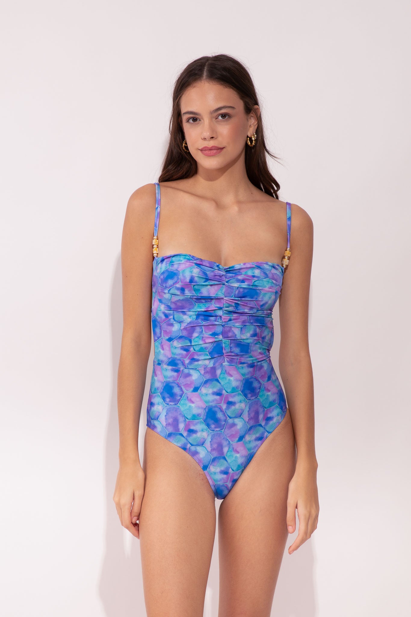 Maiô com Decote reto com drapeado delicado no busto e alças finas com com regulador e detalhes de acessório dourados e de resina madrepérola. Modelagem versátil que pode ser usada também como body.