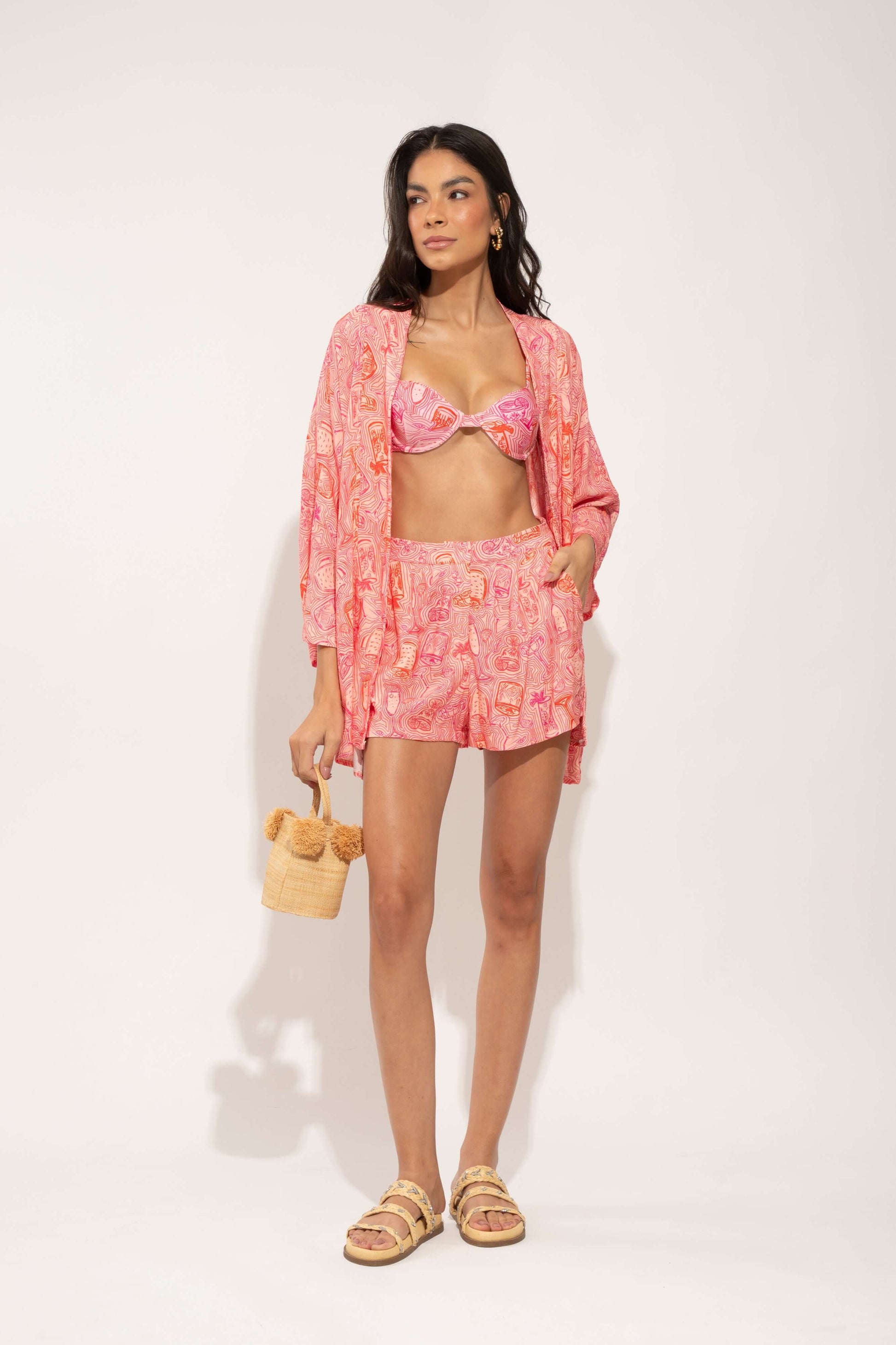Quimono com mangas largas feito em tecido super gostoso e com fios de lurex. O quimono vem com cinto feito de corda de São Francisco e Tassel que pode ser usado por cima acinturando a peça ou não, deixando uma peça mais soltinha. Ele fica lindo usado por cima de maiô e biquíni e com conjunto com o Short Aninha na mesma estampa ou a Calça Linho Marina, fazendo um look mais urbano.
